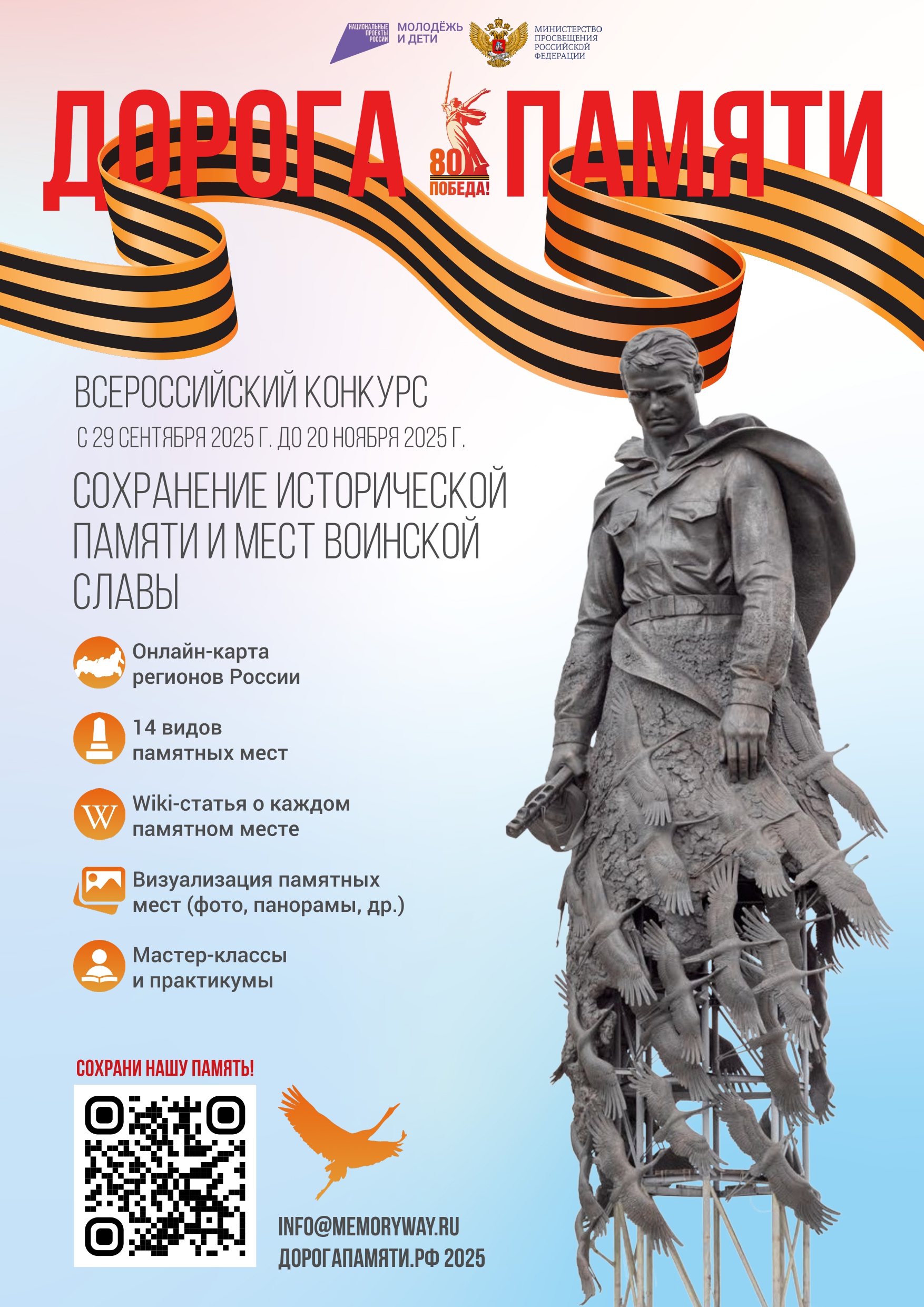 Регистрация для участия в Конкурсе открыта с 29 сентября по 20 ноября 2025г. на сайте проекта в сети Интернет — https://дорогапамяти.рф/.